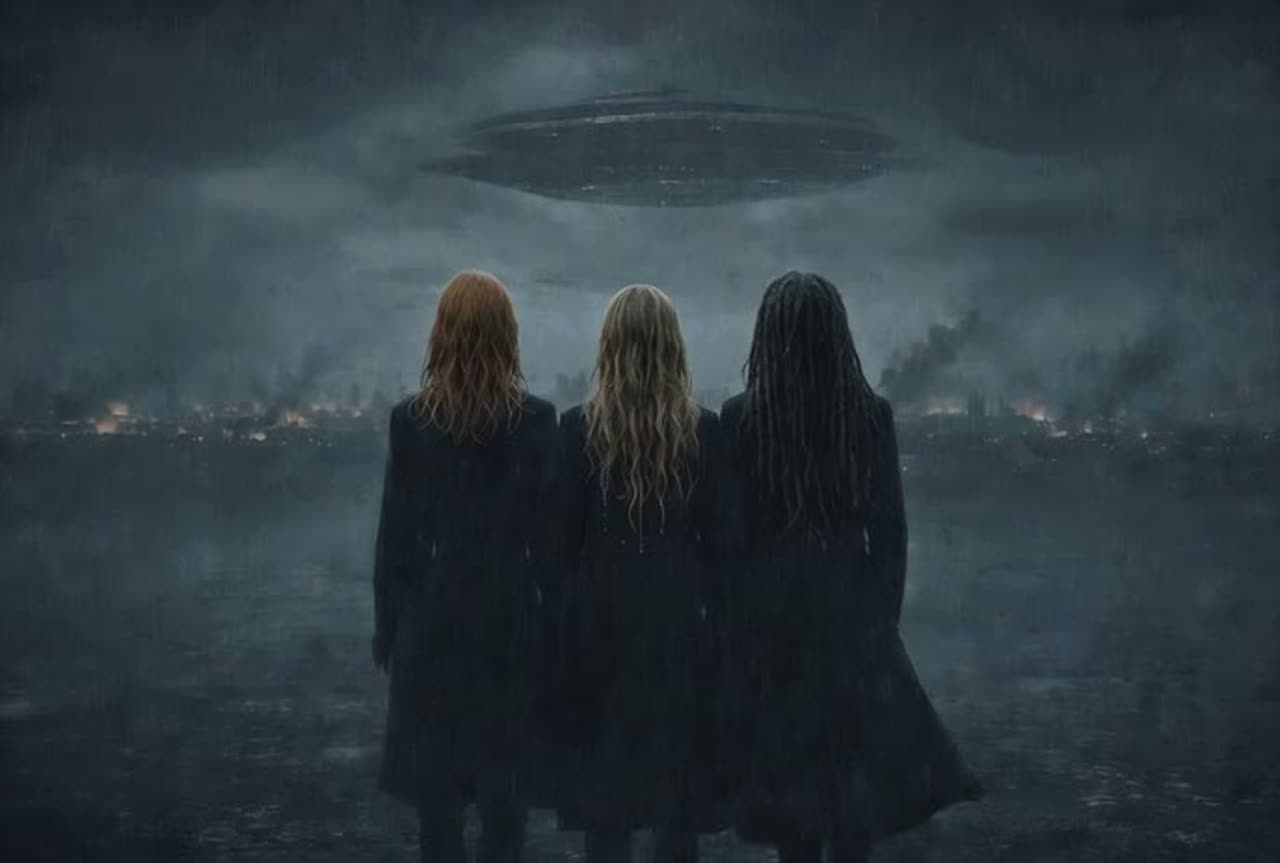 mid-90s sad and dark but hopeful alternative rock ballad with the feel of a secret underground broadcast, No audience, no crowd noise, no live energy, The band plays in a small, improvised bunker studio: dry acoustics, concrete walls, low ceiling, Guitars slightly rough, muted highs, steady and restrained — nothing bright or cheerful, Bass deep and simple, drums tight and close-mic’d with very little reverb, Lead vocal tired, low, steady — like someone speaking to people who might be hiding, Background harmonies soft and narrow, almost whispered, not polished, Subtle atmospheric pads used only for tension, like low air pressure or distant machinery, Overall mood: quiet determination in a collapsing world; three exhausted women sending out a signal of strength, Mix dark and controlled: soft compression, warm mids, rolled-off highs, No stadium sound, no open-room reverb — only the tight bunker space, ‑cheering, ‑live audience, ‑bright reverb, ‑festival vibe, ‑upbeat mood, ‑pop gloss, ‑dance energy