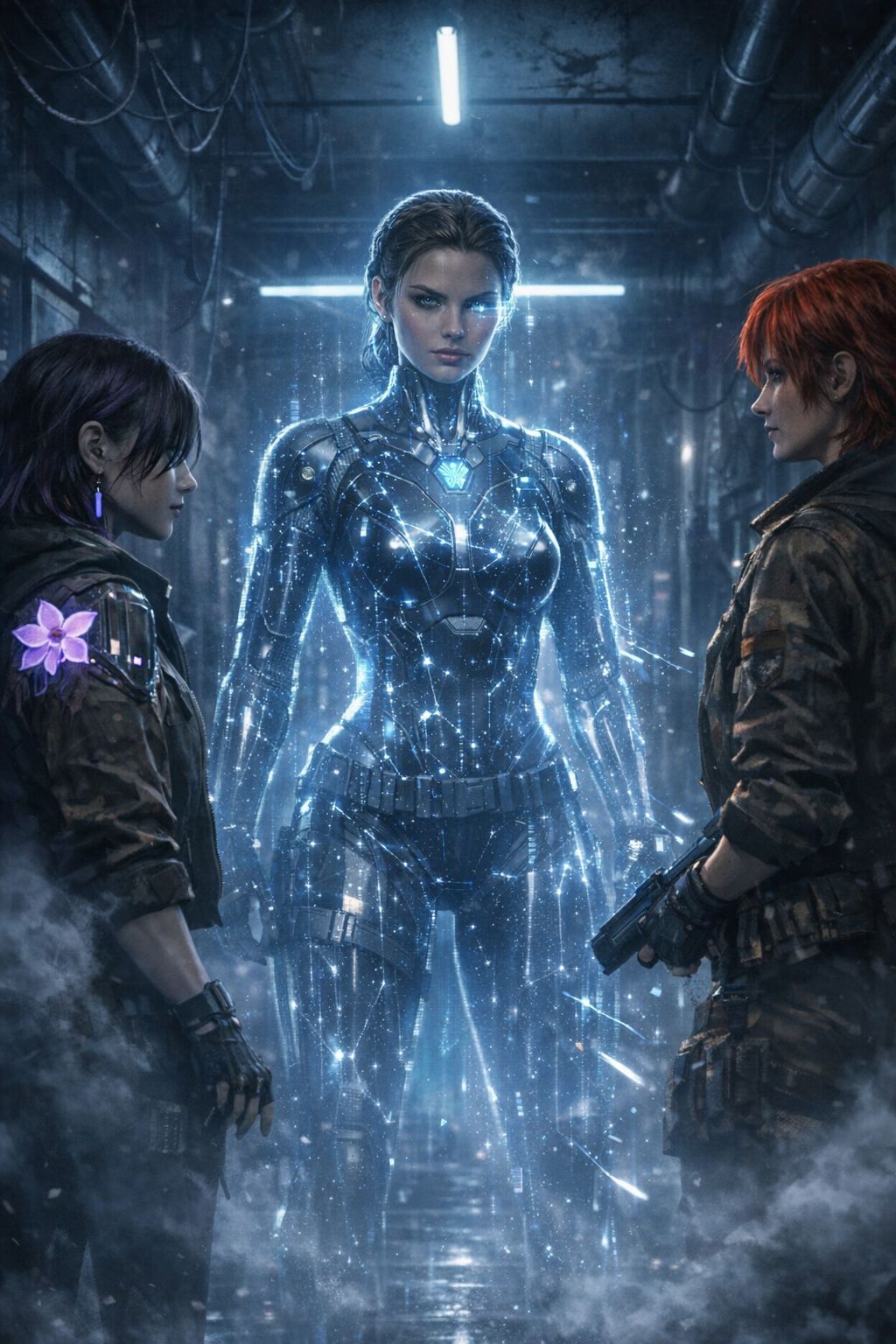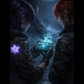 alt-rock, cyber-requiem, cyberpunk rock, ballad, mythic, industrial rock, cyberpunk noir, electro industrial, darkwave, 132 BPM, half time groove, distorted synth bass, palm muted baritone guitar, textured electric guitar, metallic percussion, glitchy beat edits, radio click intro, tape saturation, plate reverb snare, analog compression, stereo widening, Male lead for CyAn: haunted, intimate, fragile, slightly glitched and degraded like an old buried facility speaker, with subtle female ghost-layer doubling in places to suggest a hybrid voice, Female lead for Eragat: hoarse, controlled, militant, protective, emotionally restrained but forceful, Start with CyAn alone in the intro and first verse, Bring Eragat in as the clear witness voice in verse 2, Keep early sections mostly solo, In the choruses, use layered male/female harmonies rather than full unison, In the spoken bridge, Eragat is close and steady, while CyAn splits briefly into male and female responses