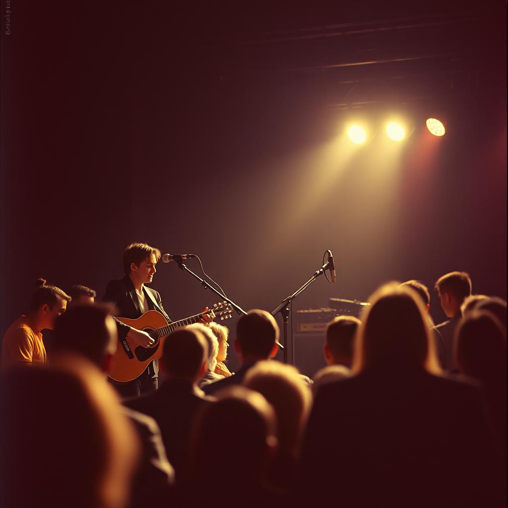 The live acoustic concert recording opens with warm acoustic guitar and sporadic, clear flexitone accents atop a singer-songwriter folk backdrop, Soft cajรณn, hand drums, and bongos establish understated rhythm, while a smooth electric bass anchors the groove, Ambient live room sounds and audience energy infuse authenticity throughout