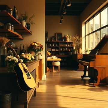 Create a modern instrumental track for a small-town flower shop with hidden magic, grounded and understated rather than whimsical, The music should feel calm, cozy, and slightly introspective, with a quiet sense of something unusual beneath the surface, Tempo is relaxed and steady, suitable for background ambiance, Instrumentation includes muted acoustic guitar, soft piano, warm bass, minimal percussion, and very subtle atmospheric textures, Avoid bright chimes, cartoonish sounds, or overt fantasy flourishes, The mood should feel contemporary, earthy, and lived-in—like fresh greenery, wooden counters, late afternoon sunlight, and unspoken secrets, The magic should be implied, not announced, No vocals or lyrics, The piece should feel loopable, cinematic, and emotionally grounded, closer to indie folk or ambient pop than animated fantasy
