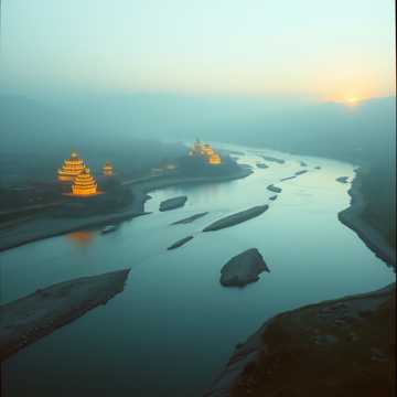 Majestic Cinematic World-Folk, 72 BPM, [Panoramic soundstage], [Deep resonant percussion], [Layered choir harmonies], [Soulful cello and sweeping violin strings], [Clear bilingual vocals], [Atmosphere of a sacred river meeting the sea]