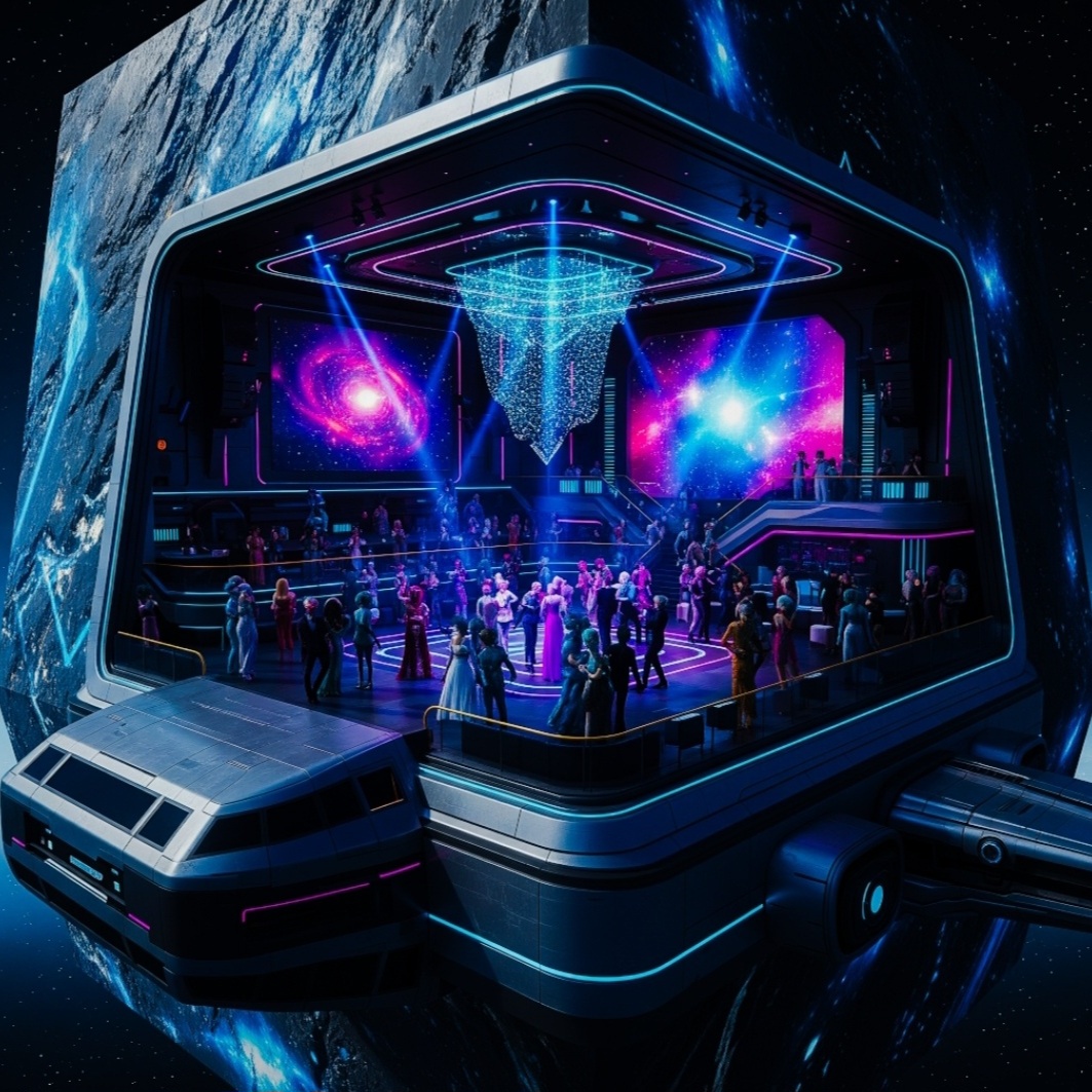 Futuristic experimental club anthem blending deep luxury rap vocals with iconic disco-pop harmonies, Hard-hitting 808s meet shimmering synth arpeggios and celestial choirs, Rich orchestral layers merge with robotic vocal effects, vocoder harmonies, and interstellar bass drops, Epic cinematic intros, funky-style piano stabs, and hypnotic trap beats, Lush transitions, ambient breakdowns, and a transcendent atmosphere made for a high-end, galactic nightclub