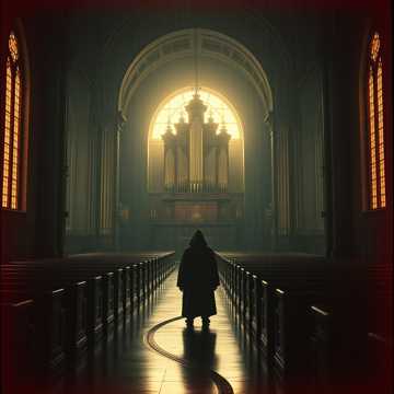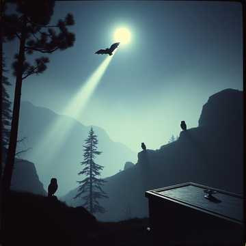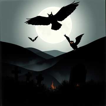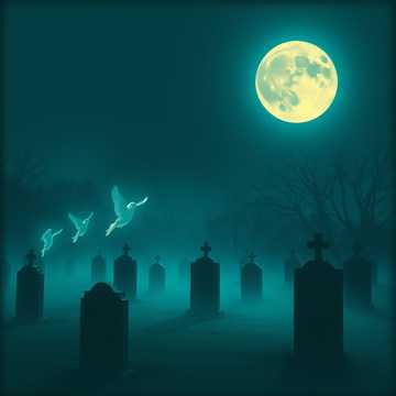 A haunting, but very beautiful melodious music that gets into people's ears, A beautiful melody that takes place in a cemetery during a full moon and is about cemetery ghosts who come back from the afterlife to haunt people because they have some unfinished business and spiritual pain, so they are sad and come back every night, On a full moon night, crickets chirp, owls hoot and wolves howl, death metal, horror synth, humming choir, owl hooting, cricket chirping, wolf howl