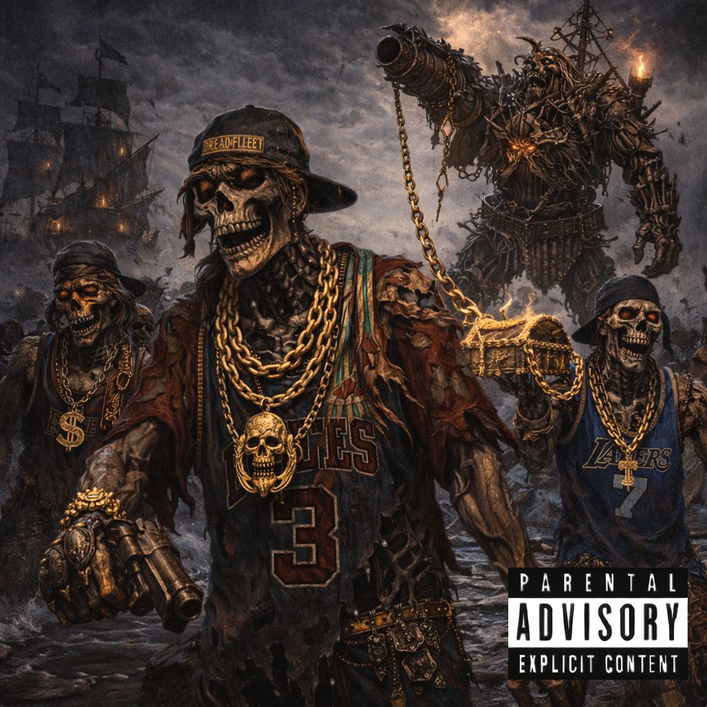 90s Pirate Rap, Horrorcore Boom-Bap, Heavy bass, creaking wood percussion, Cannon blasts as beat accents, Slurred-but-commanding delivery