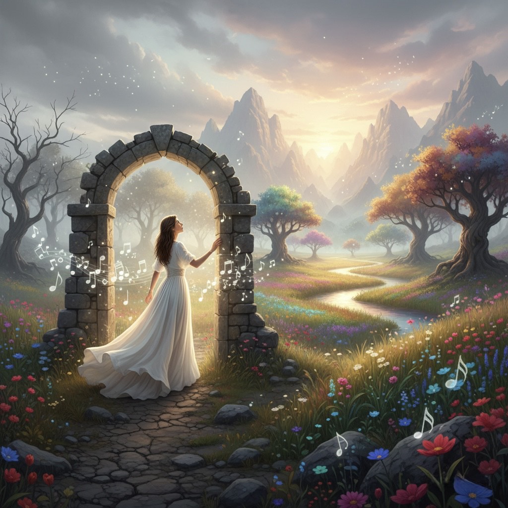 Epic cinematic orchestral song, Soft female lead vocal with emotional, airy tone, Occasional angelic choir for the chorus, Rich, atmospheric arrangement, Intro: swelling epic strings, solitary violin, soft female hum, rain ambience, distant thunder, Verses: intimate, delicate cinematic pads, soft piano echoes, violin lines that feel like brushstrokes, gentle heartbeat-like percussion, Chorus: wide orchestral bloom, deep cinematic drums, rising strings, subtle background choir, emotional lift, Verse 3: panoramic, majestic mood — mountain-like openness, soft winds, gentle angelic choir, Final chorus: full epic climax with powerful choir, large drums, soaring strings, golden-film-score atmosphere, Outro: tender violin harmonics, fading reverb, soft female whisper-like vocal, cinematic fade to black, Style: epic, cinematic, orchestral, emotional, film soundtrack, dramatic build-up, lush violins, warm pads, angelic choir, reverb-heavy, atmospheric