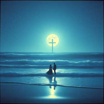 – Rhythm: deep, minor-key riffs, oceanic and heavy, slow-burning sorrow with massive presence, – Harmony: wide melodic twin leads, romantic and tragic, carrying longing and undying bond, – Lead: expressive, emotional solos with long bends and sustained notes, aching rather than aggressive, Keyboards: cold cinematic pads, distant church organs, ghostly choir textures, subtle bell chimes, sea-wind and echo FX, Drums: steady, ceremonial, like waves against stone—solemn, unstoppable, Vocals: clean male vocals with light rasp; intimate, mournful verses; powerful, anthemic choruses with layered backing vocals like voices of the dead and stars, Mood arc: innocent love → loss → grief → defiance