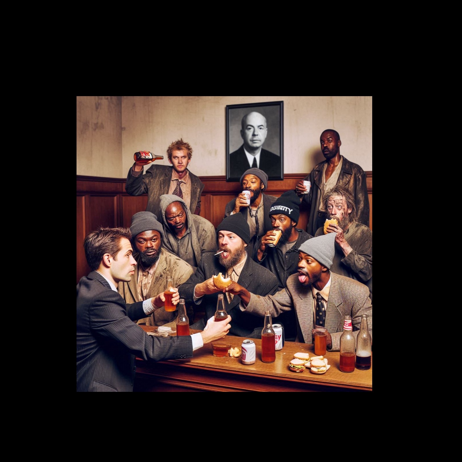 1980s old school rap hip hop, Multiple voices, Voice one is male African American base, Voice 2 is tenor male African American raspy, Voice 3 is male soprano Caucasian, Voice four is african American ghetto male, 120 BPM, this track rides a tight, infectious rhythm with a moderate tempo that’s perfect for head-nodding and dancefloor vibes, The backbone is a punchy bassline, laying down a deep, bouncy funk groove, paired with crisp drum breaks featuring sharp snares and kicking hi-hats, Layered over this is a rhythmic electric guitar riff, adding a touch of soulful swagger, while subtle turntable scratches bring that authentic street flavor, A hint of brass stabs pops in for extra punch, keeping the energy high