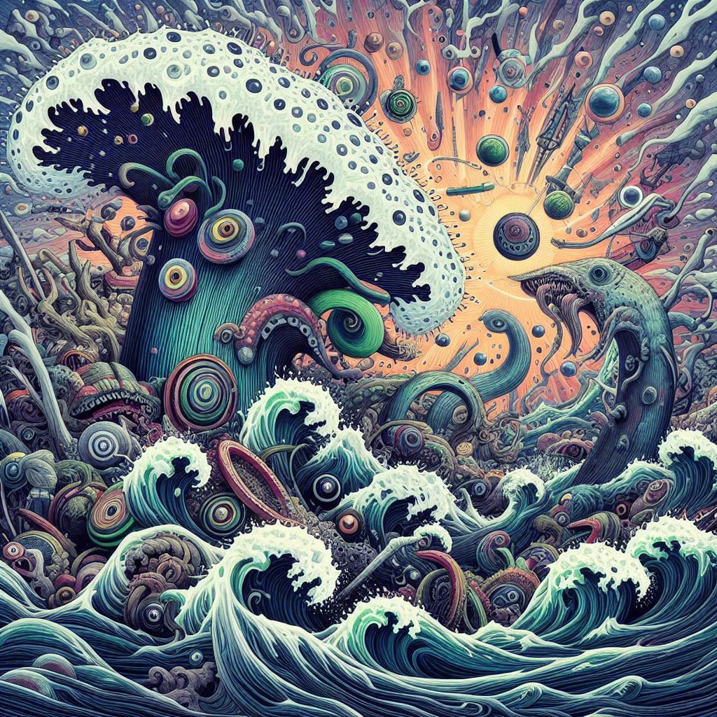 A wildly unique, avant-garde psychedelic progressive rock epic featuring complex arrangements, layered experimental synths, acid house touches, deep rumbling bass, climactic hard rock drums, and hard rock guitar ensembles, Eerie, breathy vocals and chopped samples float in dense, atmospheric, rhythmic textures with pulsating and minimal electronic beats, sound art effects, and haunting, layered soundscapes, with ethereal chopped vocal samples, dramatic hard rock, epic psychedelic progressive rock journey with extended, complex arrangements, Layered experimental synths, acid house undertones, deep rumbling bass, and epic hard rock drums merge into dramatic crescendos, avant garde, electronic deep deep bass, bass guitar, dark edm beats, psychedelic acid rock, rhythmic music, electric guitar