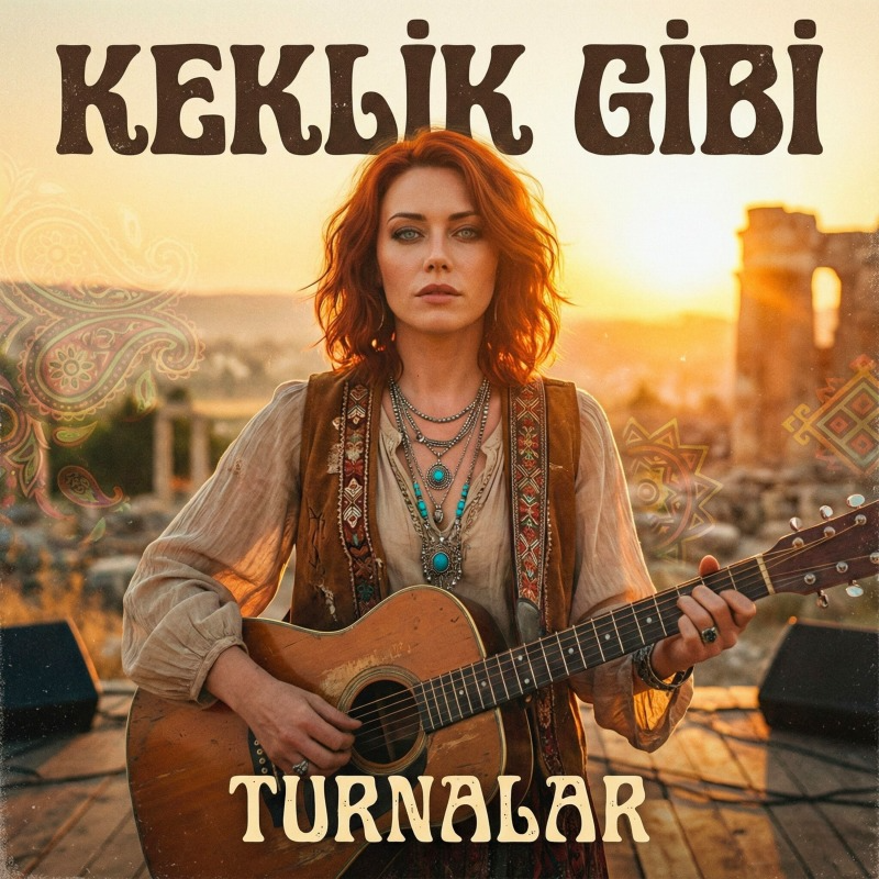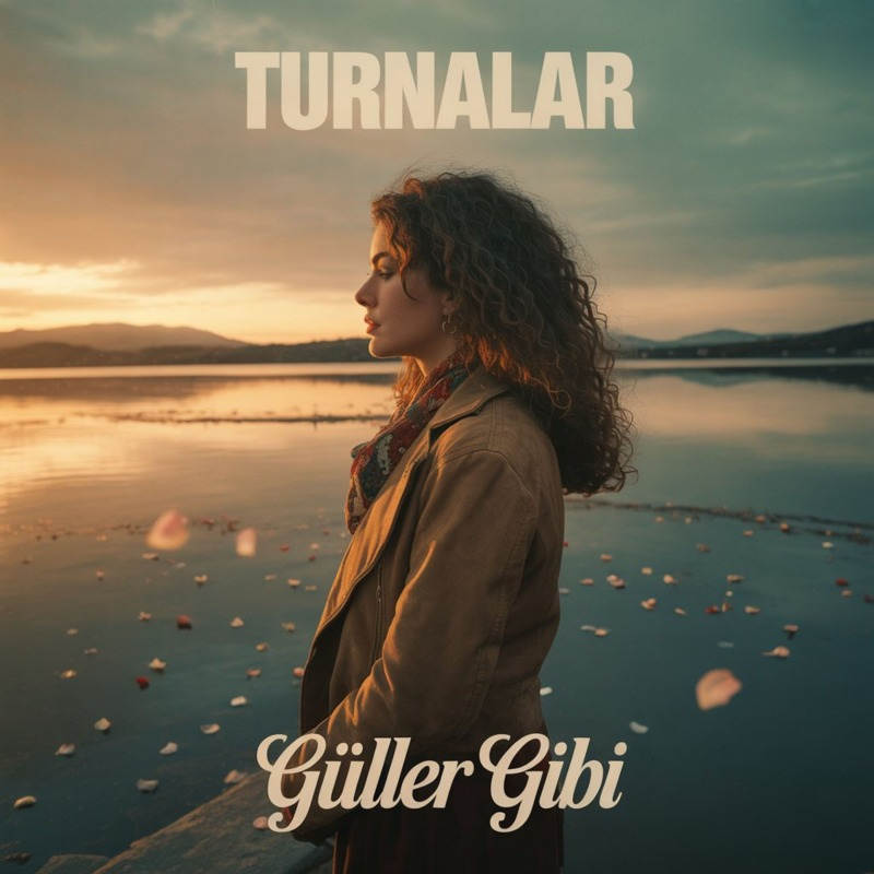 Create a 1970s Anatolian rock track titled “Güller Gibi” by Turnalar, based on Ahmet Haşim’s poem “Akşam”, Tempo ~82 BPM, key Am, Start with reverb-soaked clean guitar arpeggio (Am–F–C–G) and soft female vocal, After 20s, add warm bass and mellow vintage drums, Use Stratocaster with analog delay, electric bağlama for call-response, and a subtle mellotron pad, Drums: Ludwig 70s kit, loose hi-hat, tom rolls, Female vocal tone: smoky, emotional, Turkish phrasing with mystical expression, Verses calm and intimate; choruses (“Akşam, yine akşam”) wide, soaring, and reverb-heavy, Mood: dreamy, melancholic, nostalgic, feels like sunset over Anatolia, End with guitar solo drenched in tape delay, fading slowly, Length ~3, 5 min