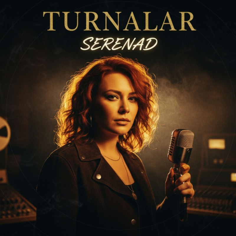 Create a 1970s Anatolian rock song titled “Serenad” by Turnalar, inspired by Cahit Sıtkı Tarancı, Tempo 84 BPM, key Em, Instrumentation: fuzz electric guitar riffs, dry vintage drums, round analog bass, subtle Farfisa organ, Very light background flute texture for atmosphere, never in front, Female lead vocal: confident, full-bodied, raw Turkish tone — not dreamy, not soft, She sings with strong chest voice and emotional grit, slightly raspy edge, Verses tight and close, choruses open wide with layered harmonies, Warm analog tape mix, no delay, minimal reverb, End with sustained fuzz guitar solo fading naturally, Duration ~3:45