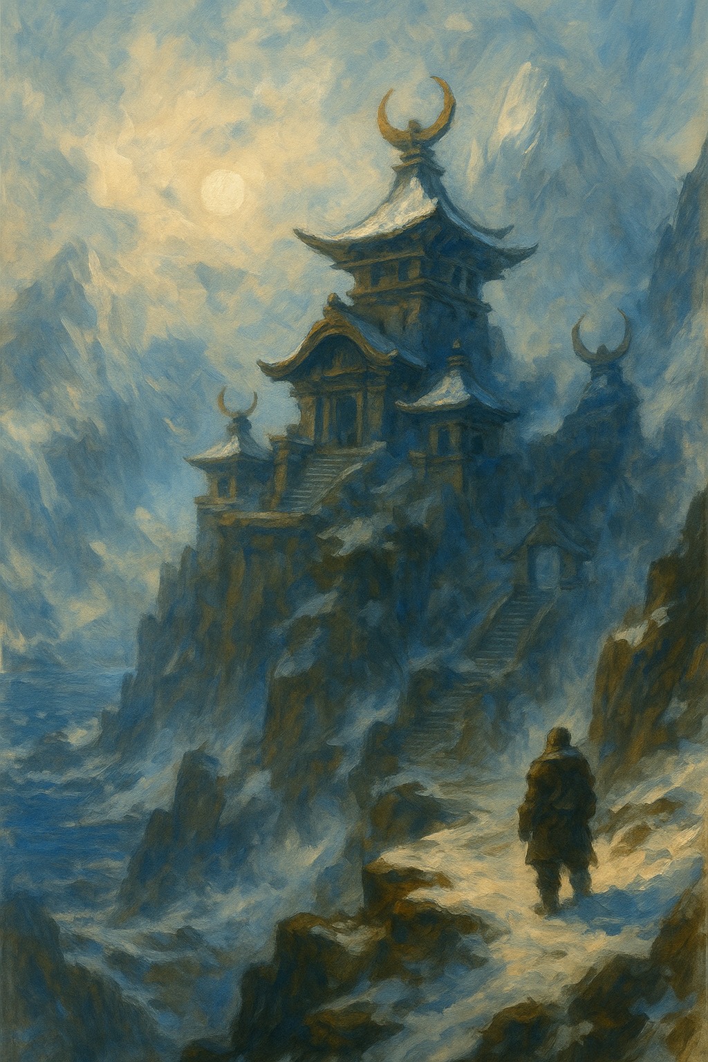 snow, fast-paced dark industrial electronic soundtrack at 145 BPM, combining cold atmospheric synth layers with mechanical winter, ice, percussion and deep metallic bass, echoing through icy caverns and misty cliffs, cinematic steampunk energy with frozen winds, crystalline textures, and ancient spiritual undertones, evokes PvP combat on a sacred iceberg sanctuary where silence meets fury