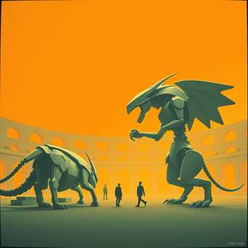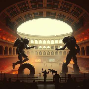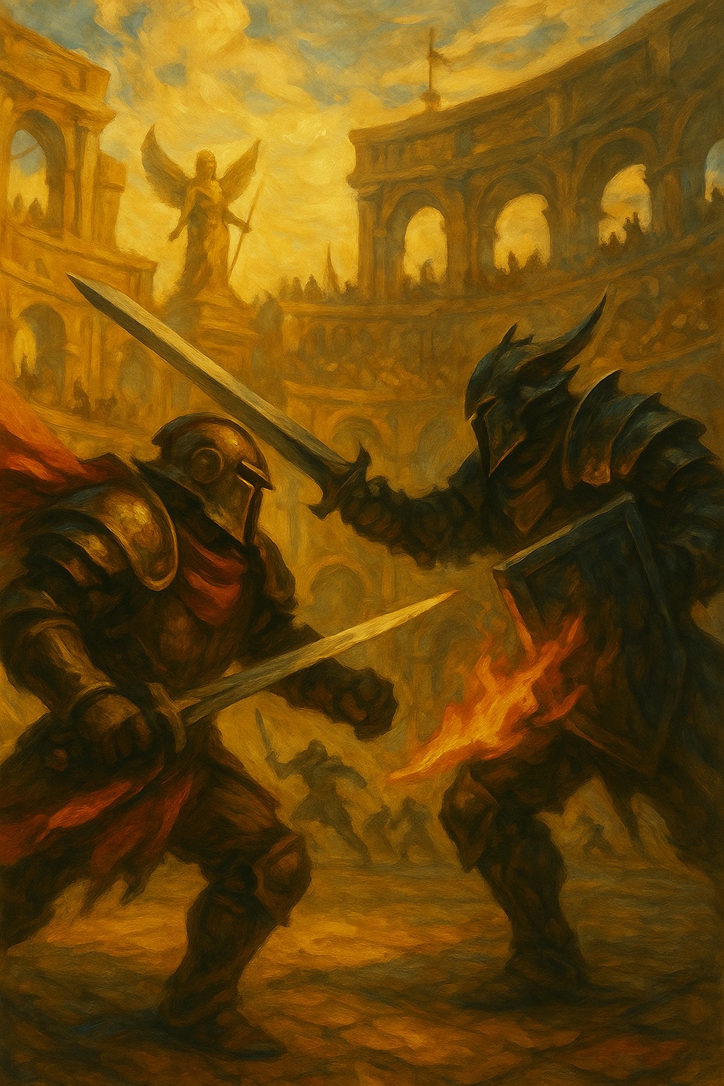 gladiator, rapid industrial rock-electronic hybrid at 150 BPM, pounding drums and roaring basslines, crowd chants blended with steampunk machines, heroic yet brutal tone, cinematic PvP battle theme for a high-intensity coliseum fight
