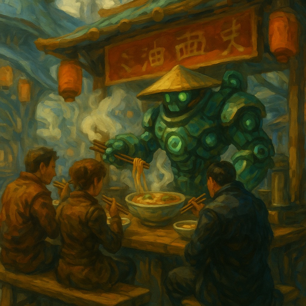 chill industrial-electronic lounge track with steampunk and cyber-asian influences, mechanical lo-fi beats, soft metallic percussion, subtle steam hiss fx, and warm synth pads, playful yet relaxed atmosphere, like a PvP lobby noodle shop run by jade bots between matches, fusion of futuristic restaurant ambience and dark fantasy technology, mid-tempo groove around 95–100 BPM, cozy but still part of the arena world