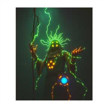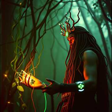 medium-fast fantasy rock electronic track at ~135 BPM, strong guitar riffs and driving drums, layered with organic plant textures (rustling leaves, vine pulses), orchestral strings and ambient synths, heroically mystical atmosphere, evokes a warrior-druid bending nature’s will in a high-tech fantasy world, fusion of rock energy and magical green power