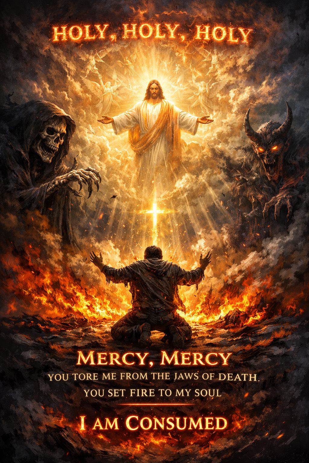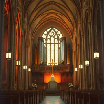 metal, Warm church pipe organ and male-female choir, doubled by clean electric guitars that swell into thick, reverent metal crunch on refrains, Steady mid-tempo 6/8 pulse, tom-driven drums undergird the congregation, with big open chords and sustained organ drones, Verses begin gentle and hymn-like; each return of the same melody grows in intensity as choir and distorted guitars join, creating a towering, cathedral-metal wall of sound that still leaves space for clear congregational singing, simple, praise, worship, warm