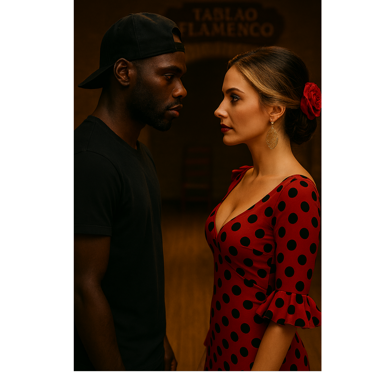 male vocal, female vocal, reggaeton track infused with flamenco elements, Use a dembow rhythm as the base (around 90โ100 BPM), with crisp snares and deep kicks, Layer it with palmas (handclaps), flamenco-style acoustic guitar riffs, and occasional rasgueos for authentic texture, Add subtle cajรณn percussion to enrich the rhythm section, The harmony should blend Latin urban chords with Spanish-style progressions, Include dramatic, melodic flamenco vocals or flourishes as fills or background accents, The main vocals should ride the beat rhythmically, but allow space for emotion and melody, especially in the chorus, Use minor keys to evoke longing and passion, Include ambient textures like reverb-drenched claps or vocal ad-libs, The bridge can drop the beat briefly and highlight flamenco instrumentation before the final chorus hits harder, Aim for a sensual, intense vibe that merges modern reggaeton energy with flamenco's raw, emotional power
