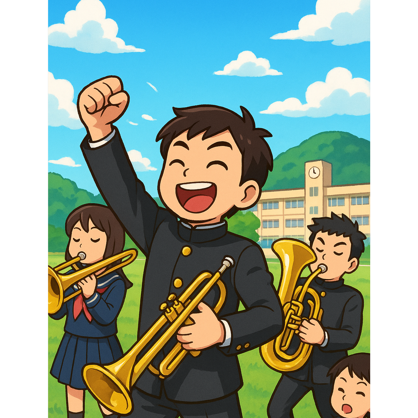 Create a lively and humorous high school march song in the style of a Japanese school brass band, The song should follow the structure: Verse → Pre-Chorus → Chorus → Verse → Pre-Chorus → Chorus, Instrumentation: