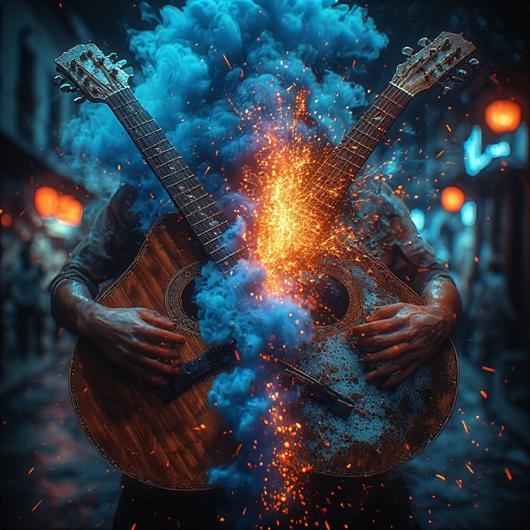 Fast Spanish Guitar and Mandolin Call-and-Response Solo, Duel between acoustic guitar and distorted mandolin, Flamenco-style picking, High-tension virtuoso strings, Distorted Guitarra Baiana, Psychedelic Electric Mandolin, Heavy Dub Basslines, Driving Bahian Sound System, Global Bass, Afro-Brazilian Percussion, Samba-Reggae fusion, Kuduro influences, Tropical Bass, Synths and Timbales, Staccato Rhythms, Explosive Brass Hits, High-energy Salvador de Bahia Carnival Rave, Vibrant Summer Bass Music, Duet, Powerful Male Vocals, Soulful Female Vocals, Energetic Chants, Gritty and Powerful