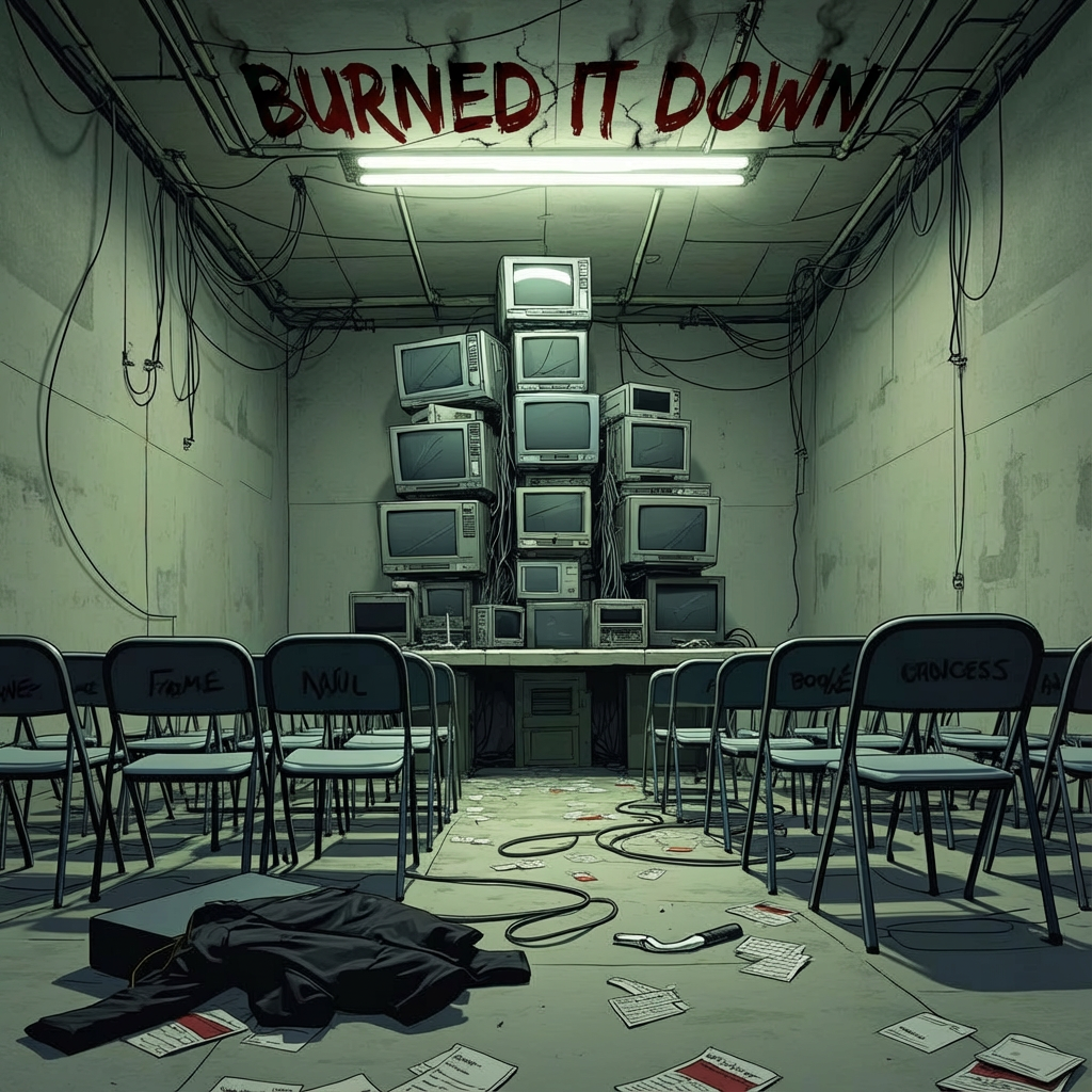 This experimental phonk/industrial hip-hop track (~86 BPM, C♯ minor) fuses abrasive noise with rap delivery, Opening with processed spoken word over claustrophobic ambient drones, the piece shifts from lo-fi tension to high-fidelity aggression, the arrangement erupts into distorted electronic drums, punchy kicks, and saturated synth bass punctuated by harsh industrial clangs and feedback, Vocals evolve from deep, ominous narration into heavy vocoding and finally raw, shouted aggression, Lyrical themes are violently nihilistic and apocalyptic, anti-authority sentiments, Lacking a conventional chorus, the structure relies on sharp dynamic swings—alternating between relentless "wall-of-sound" intensity and brief silence—before dissolving into a fragmented, fading outro, The aesthetic embodies chaotic menace and dystopian despair