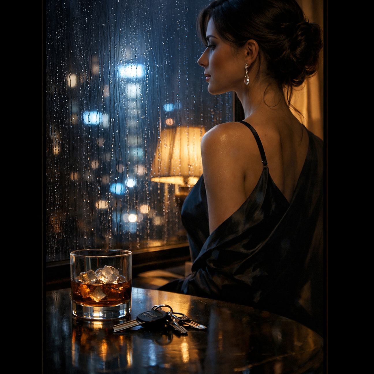 City Noir / WhisperIntimate, 88 BPM, rain-soaked nocturnal jazz-pop with close-mic ASMR texture, steady window-rain ambiance woven through the track, tactile micro-details: ice clink, fingertip glass-rub, coat fabric movement, quiet breath, key drop, soft room tone, intimate dry female lead with restrained whisper edges in the verse, breathy doubles tucked under key phrases, soft stacked harmony bloom in the chorus, brushed drums, upright bass pulse, muted electric piano, sparse sub, delicate guitar or tremolo accents used lightly, keep the groove elegant and close, not sleepy, let the verses feel dangerously quiet and the chorus widen just enough to feel like a secret becoming undeniable, stylish restraint, real pocket, urban midnight tension, no lo-fi mush, no oversized orchestral swell, no generic smoky lounge clichés, no melodramatic beltingkeep the drums present enough to maintain forward motion, avoid drifting ambient haze, the chorus must deepen and widen rather than flatten