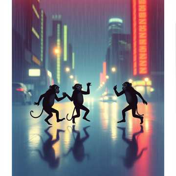 Deep House with an organic and playful autumn vibe, Tempo 121 BPM, Main instruments: deep warm bassline, muted funk guitar riff, layered conga percussion, soft Rhodes chords, and ambient rain texture throughout, Vocals: dual (male deep and female airy), alternating lead and harmony, Whispery tone in verses, full layered harmony in hooks, Mood: cinematic yet groovy, mystical yet joyful — like animals dancing freely under amber city rain, Hook structure built for repetition and memorability (“Monkeys in the rain”), Include reverb-heavy plucks, filtered pads, and light arpeggios for movement, Atmosphere: autumnal, hypnotic, playful, deep, Final drop should feel euphoric but intimate — as if the dance floor is glowing in the rain