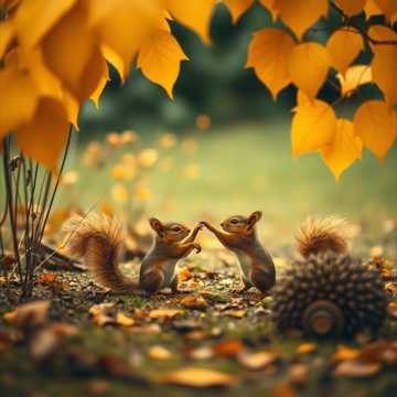 Deep House with a playful, organic autumn mood, Tempo 120 BPM, Main instruments: marimba or kalimba riff (lead), acoustic guitar with light distortion, deep rounded bass, soft shakers and claps, brushed kick, Pads: warm analog textures, faint nature ambience (leaves, wind), Vocals: duet – airy female and deep male, alternating verses, harmonized in hook, Mood: cozy, light-hearted, groovy, whimsical – like animals dancing in a glowing autumn garden, Hook uses catchy repetition (“Squirrels and hedgehogs”) and whistle melody for earworm appeal, Final drop should feel joyful, natural, and warm