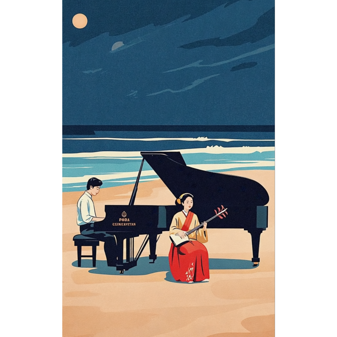 An upbeat fusion track opens with a playful shamisen intro, soft brush drums setting a light jazz groove, Upright bass and jazz piano enter, comping intricate voicings, Through each section, shamisen and piano trade lively improvised solos, culminating in a final chorus where the full jazz ensemble interplays with complex folk plucks and a highlighted tension chord, merging energy and intricacy