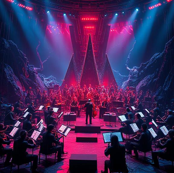 Cinematic epic orchestra with hybrid modern sound design, evolving through distinct movements; sweeping strings and brass against deep synth pulses, dynamic tempo shifts, rich choral layers, and sharp percussive stabs, moving from fragile beauty to ominous intensity and back to a transcendent finale, sonic, orchestral, musical, soft
