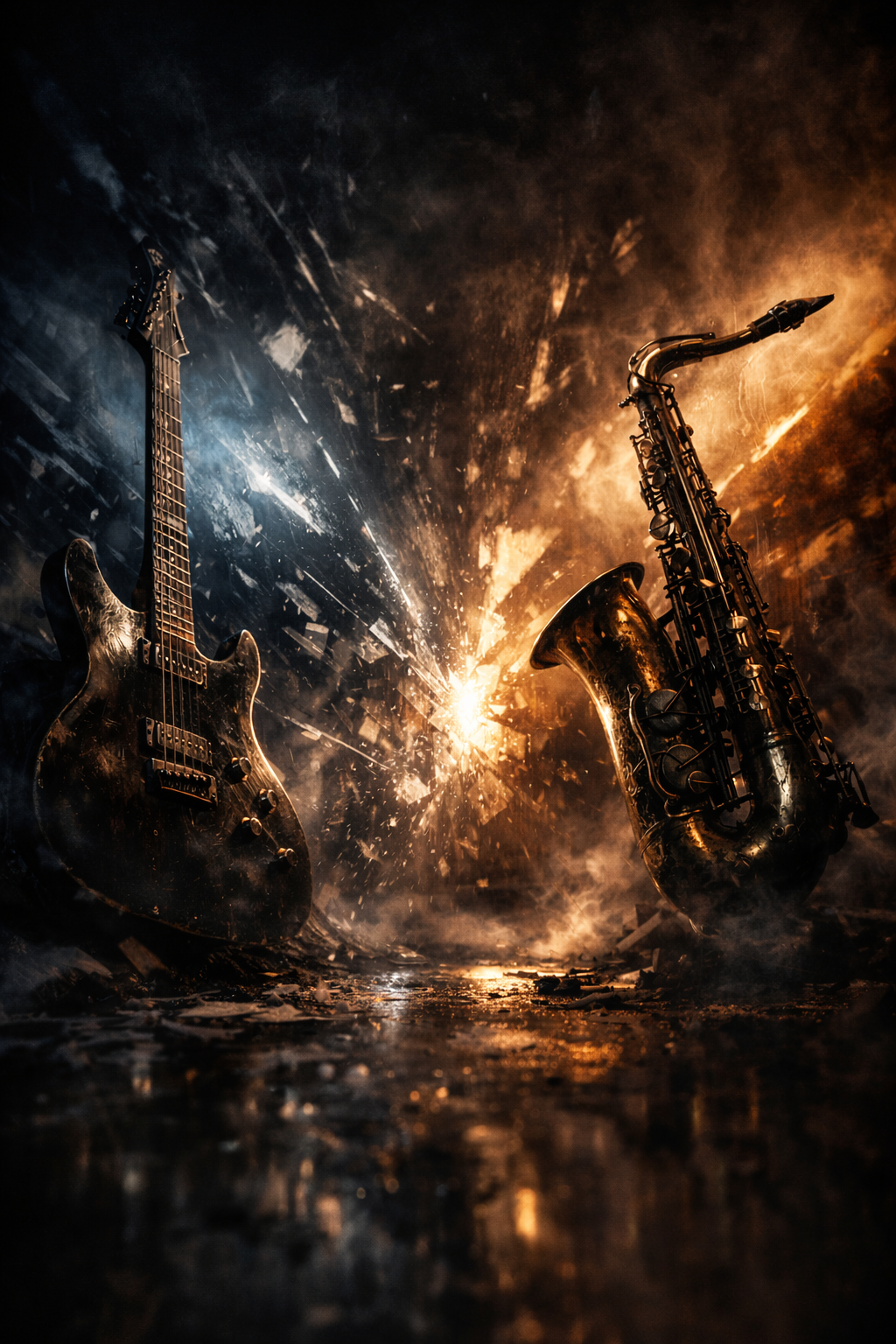 chaotic jazz metal fusion, fast tense instrumental sections with distorted electric guitar and aggressive drums, expressive jazz saxophone lead, controlled chaos, sharp dynamic contrasts, slow doom metal choruses with heavy half-time drums and deep piano chords, dark emotional atmosphere, raw exhausted deep male vocals, gravelly worn voice, restrained delivery, minimal melody, high emotional tension, cinematic, dramatic