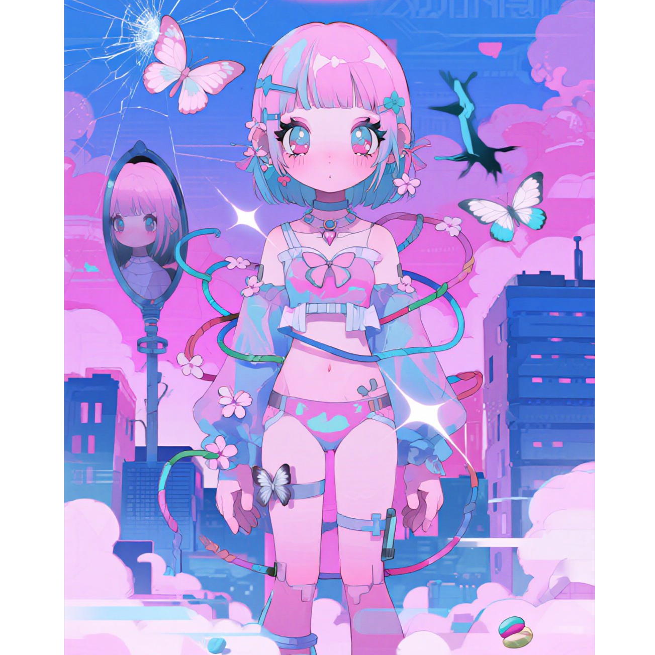 Opening with lo-fi acoustic guitar and airy synth pads, the track fuses bimbocore’s boldness with glitchy syncopated beats and playful vocal chops, Dreamwave synths and punchy drum machines drive the viral hook, while darkwave/coldwave layers add moody, textured depth between intimate, singer-songwriter verses, Tempo: ~165 BPM, aggressive but "sweet", Sound: a mix of bubblegum pop + distorted bass, with glitches and abrupt pauses, Vocals: Main - cute, cartoonish, but with hysterical breakdowns, Adlibs - high-pitched robotic, Choir - like a crowd of cyber-dolls at a rave, Chips: Inserts of distorted phrases in Belarusian (as if the radio is broadcasting "freedom"), Japanese lines sound melodic, and English ones - in a scream-whisper, Drop - resembles a carousel on steroids: fun, but disturbing
