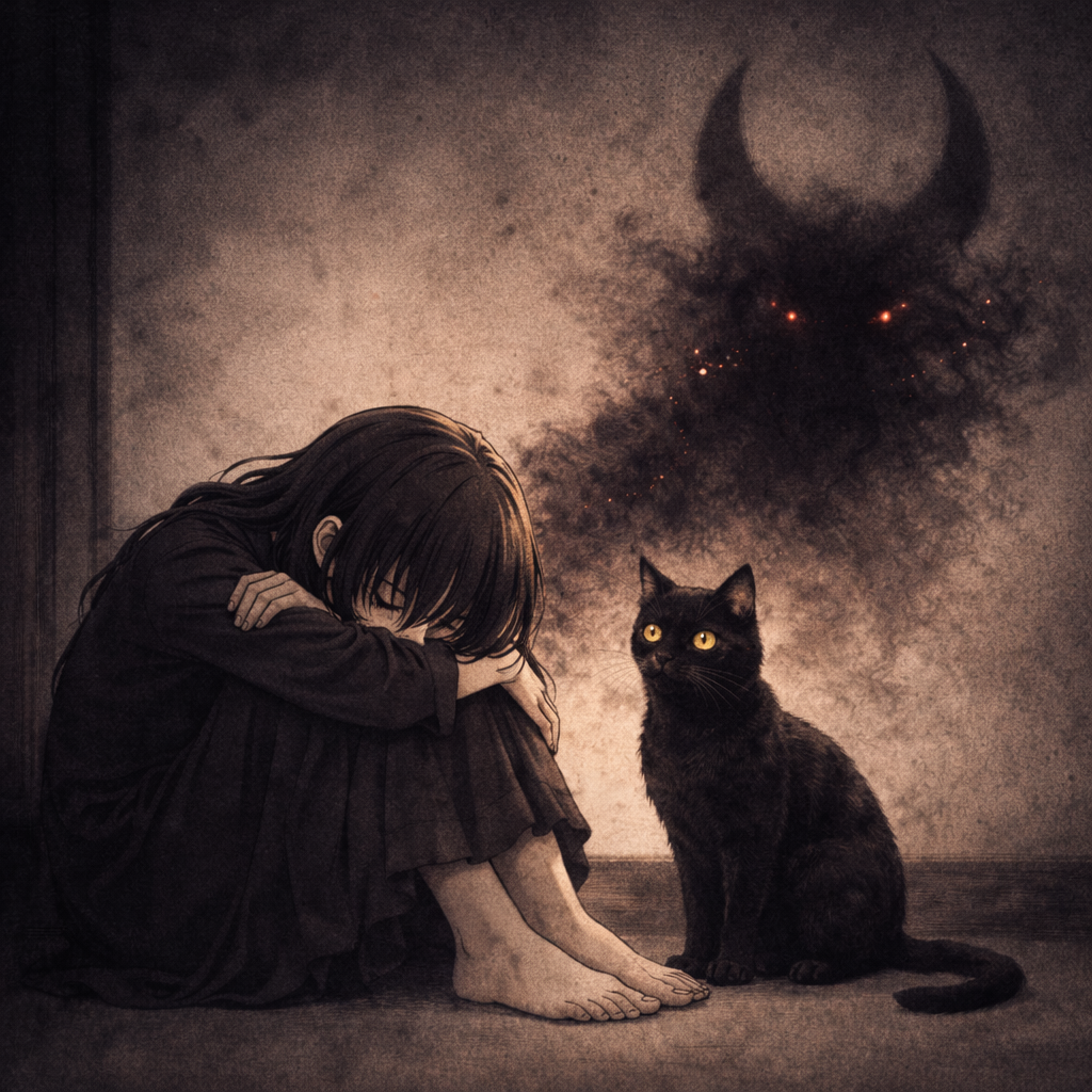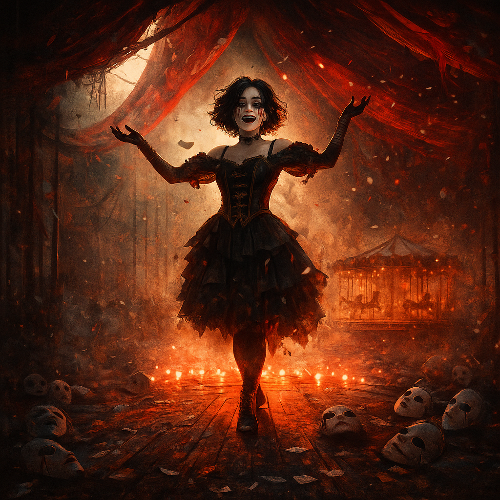 Japanese Alternative Rock, Gypsy Punk, Dark Cabaret, female vocal with male-inspired raw aggression, mumbling and storytelling verse, emotional shouting chorus, clean arpeggio guitar with chorus and delay, heavy fuzz/distortion guitars in chorus, walking bass with gritty tone, swing beat and waltz-inspired rhythmic feel, theatrical and eerie atmosphere, raw production, heavy tom fills, feedback noise, 00s J-Rock intensity