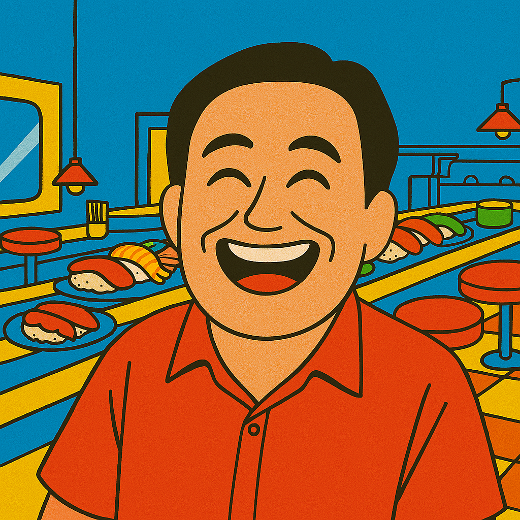 smooth male vocals, Comforting, Japanese city pop song with a nostalgic and warm atmosphere, mellow electric piano, clean electric guitar chords and riffs, mid-tempo (around 100 BPM), The song tells a sentimental story about two male coworkers (a senior and a junior) spending a quiet, heartfelt day off together—driving, eating sushi (especially "toro-bincho with sesame oil and salt"), and talking about life while watching the sea, Include AM radio textures and a touch of humor in the lyrics (like a riddle about "a ball with corners"), The mood is chill and quietly emotional, perfect for a sunny afternoon drive