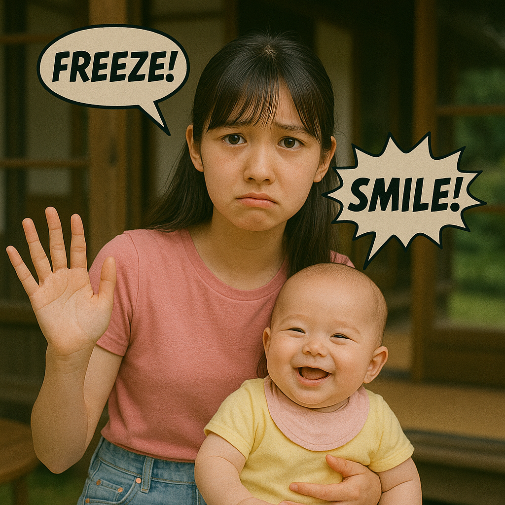 Cute pop × denpa × breakbeat fusion with strong low-end, Tempo: 170 BPM, Sparkly synths and glitchy drums create high-energy chaos and charm, Intro: acoustic guitar, retro SE (countryside vibes), baby giggle samples, warm sub-bass, Verses: chiptune melodies, bouncy bass, punchy kicks, playful wobble synth, Chorus: explosive breakbeats, bright synths, saturated bass drops, Bridge: emotional pads, filtered vocals, soft 808 pulse, Final chorus: full sparkle with layered bass stabs and glitchy subs, Vocals: female, lisping, playful tone, Lyrics: “ベイビーシッタポップ” with rhythmic bounce and vocoder harmonies, Vibe: nostalgic, sparkly, danceable, heartwarming comedy
