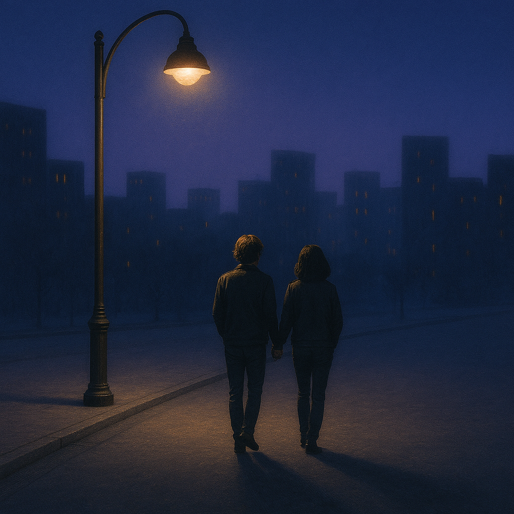 Mid-tempo 90s-style Japanese technopop, The song captures a romantic evening shared by a couple — walking home together, sharing snacks, and spending a quiet night in, Bright retro synths, soft drum machines, and gentle melodic textures create a nostalgic yet intimate mood, It’s sweet, calm, and emotionally warm, evoking the glow of city lights and quiet love, Inspired by city pop and Showa-era idol pop with a modern romantic twist