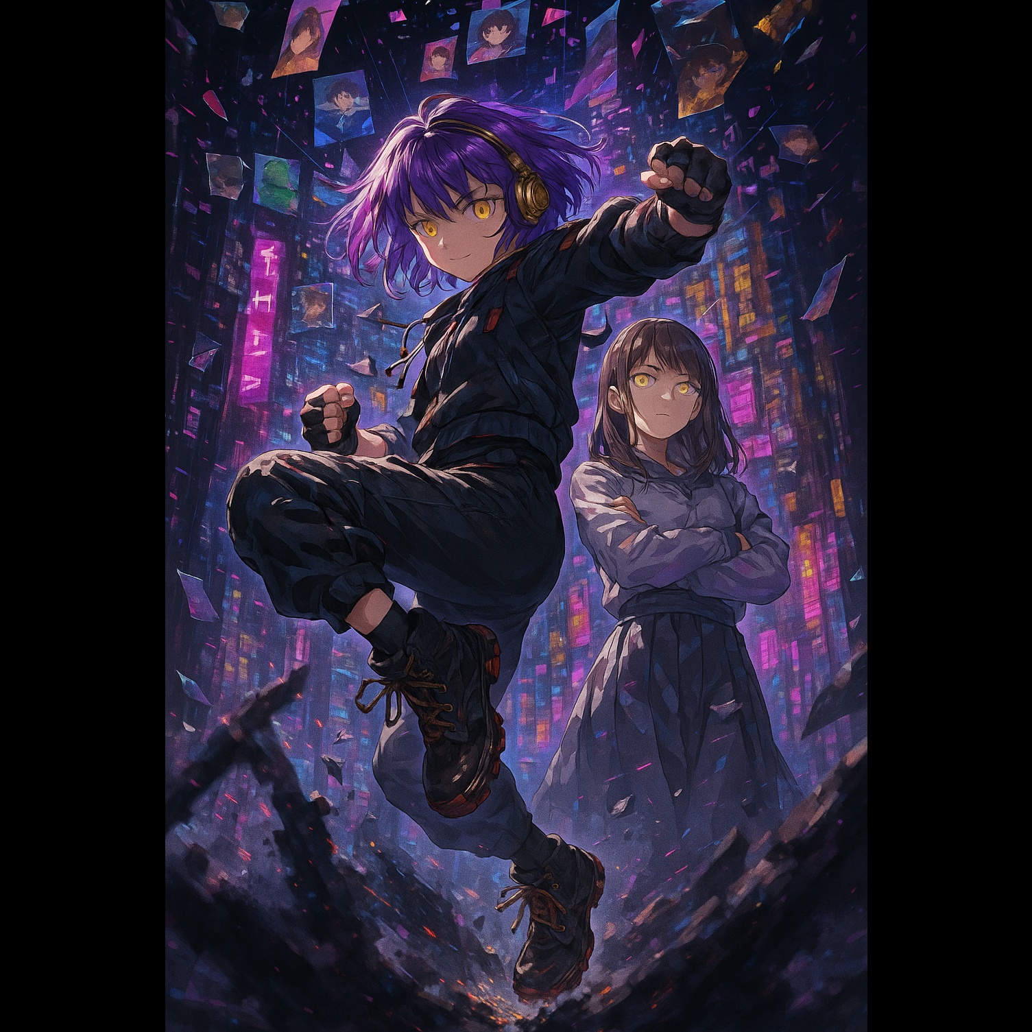 [Two rappers – META (male) and SoLa (female); danceable electro hip-hop with punchy kicks, syncopated snares, and a head-nodding groove; edgy, rebellious, and energetic with a spark-filled attitude; META is gritty and syncopated, SoLa is sweet, whispery, and playful; performance is character-driven and anime-inspired, with stylized delivery, call-and-response, and rhythmic overlaps]