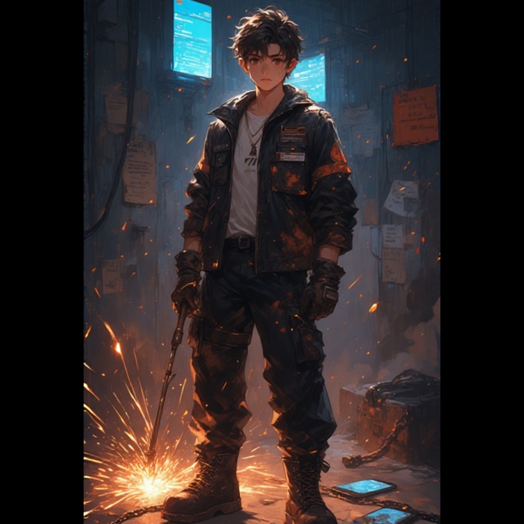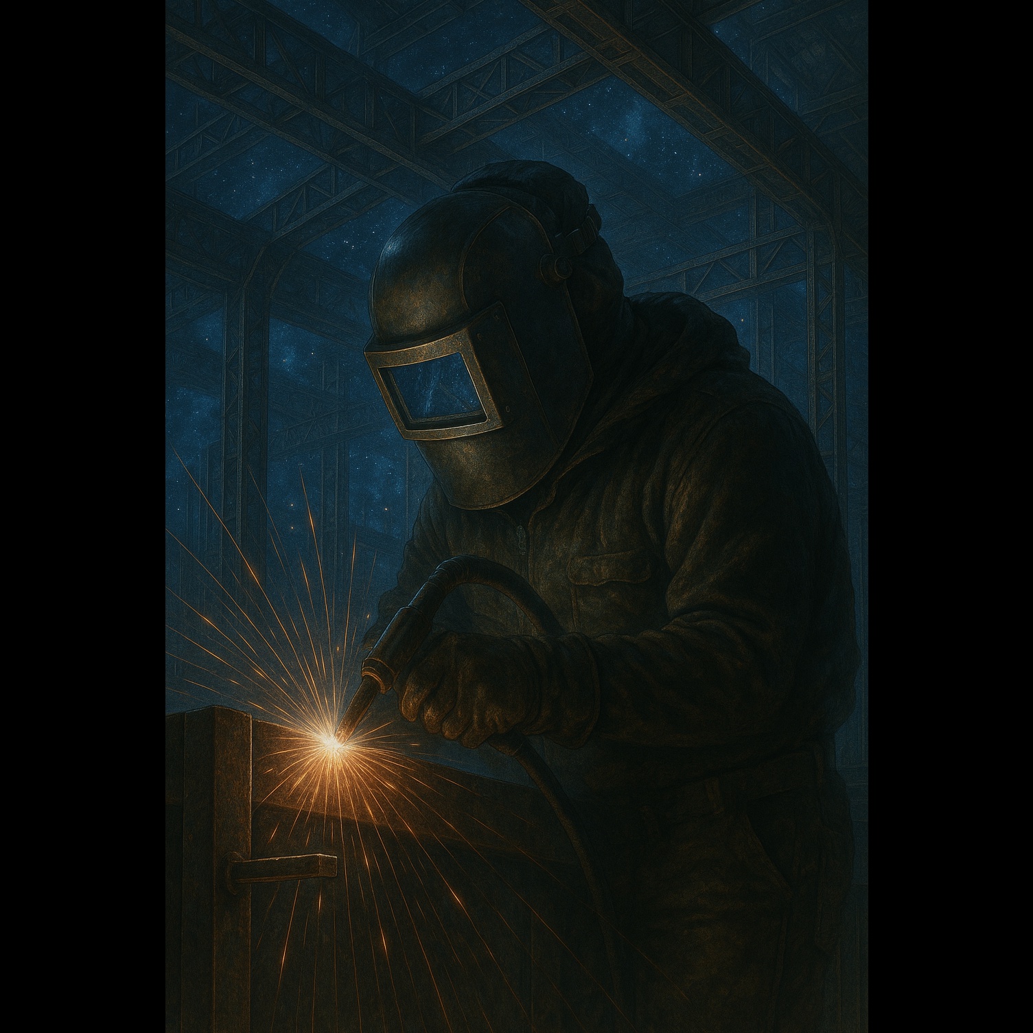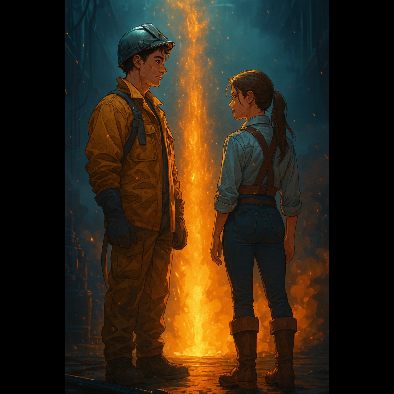 [Two vocals – KoBo-chan and SoLa-chan; KoBo has a sharp, glitchy, high-pitched voice with aggressive inflection and rapid-fire delivery, SoLa has a breathy, mellow, mid-range voice with emotional restraint and echo-laced phrasing; verses are split with each vocalist taking the lead, then overlapping during choruses; genre blends industrial rock, glitch hop, and ambient EDM; features dynamic stereo panning, layered FX (sparks, arc sounds, static), and call-and-response patterns; final chorus fuses both voices in harmony, with KoBo’s metallic grit and SoLa’s glowing reverb intertwining like molten steel; strong visual contrast between KoBo’s neon punk energy and SoLa’s ghostlike warmth is reflected in sonic textures and phrasing; outro fades with soft weld crackle and whispered phrase "We weld, like you, "]