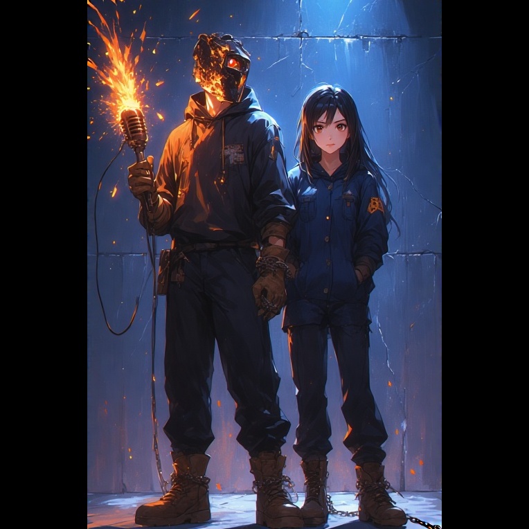 Two rappers – one female with a sharp, high-energy voice, and one male with a deep, heavy tone, This is a loud, energetic industrial party rap with call-and-response energy, No melody, no singing – just rhythmic spoken-word rap, The vibe is wild and electric, like a warehouse rave, Includes welding sparks, factory sounds, and crowd noise, KoBo starts the hype, MeTa locks the flow, They trade lines and shout in unison, Keep it punchy, raw, and exciting, This is the opening of the party – make it burn
