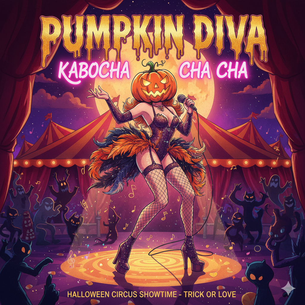 Energetic Halloween electro swing J-Pop, Upbeat big band jazz with powerful, theatrical female vocals, Fun, mischievous, and catchy
