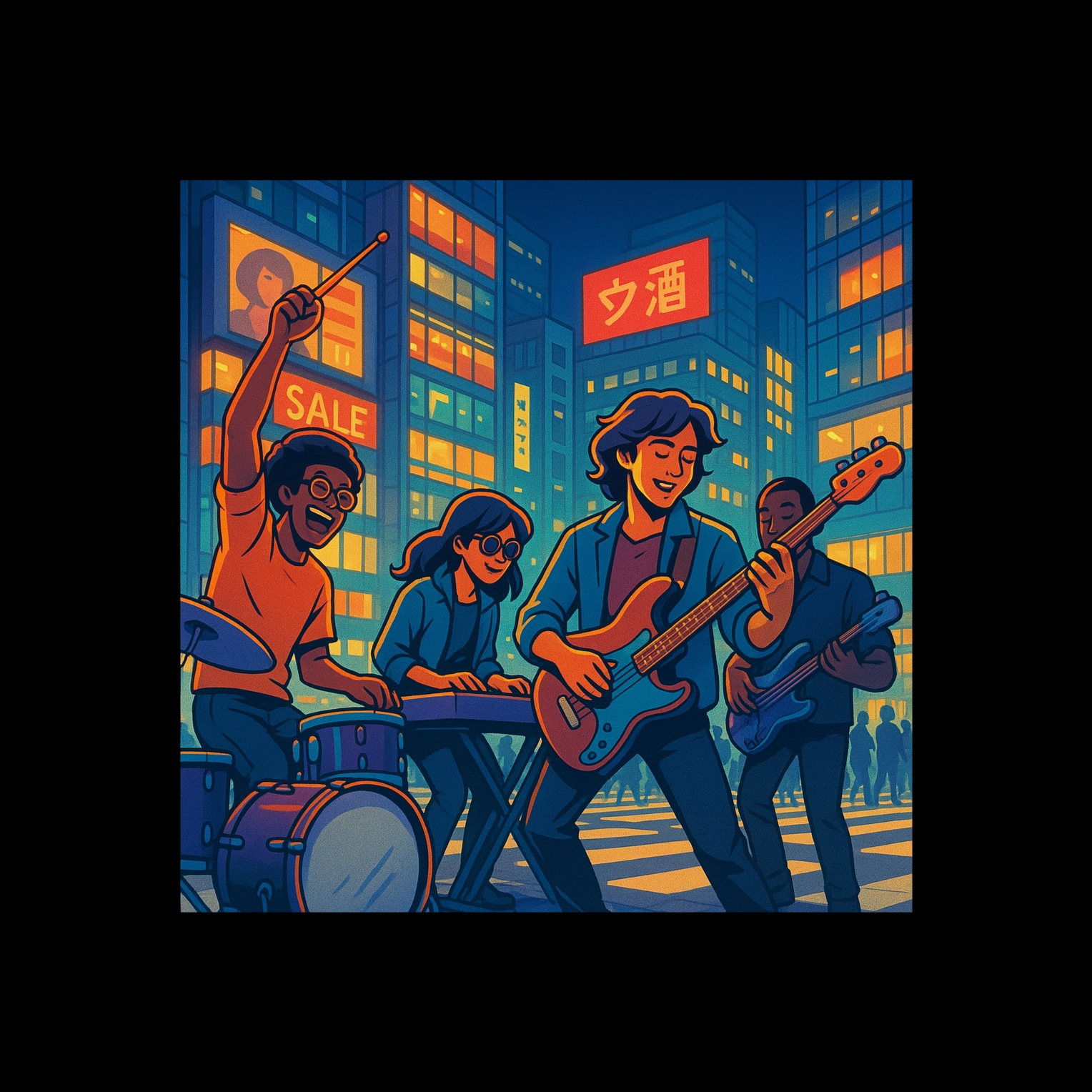vintage synthesizers, Hypnagogic+(gumbe)+Moombahton; female vocal, vaporwave, plunderphonics, A retro-futuristic scene with synthwave aesthetics, neon lights, and cyberpunk Tokyo vibes, Kpop