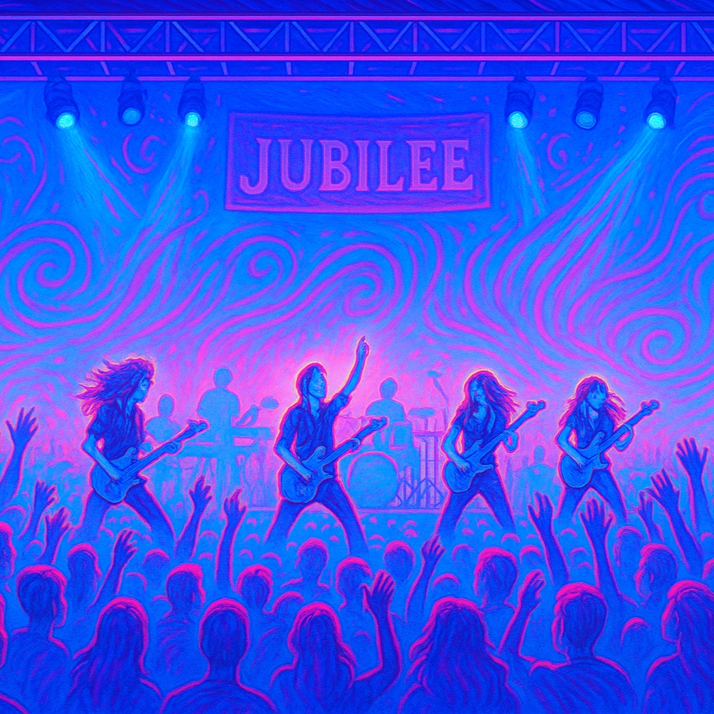 lead electric guitar, festive-prog-rock-fusion, Jubileecore, harpsichord, driving bass, steady-beat, harmonic voices, celebration, [easy to sing along], ‑country, ‑irish