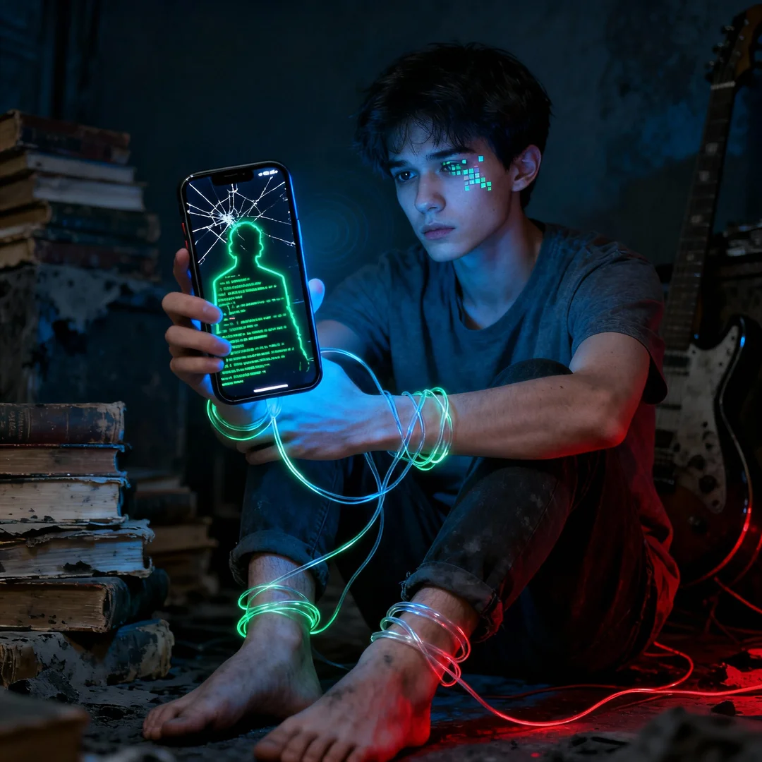 }, "dynamics": "pp (verse) to mf (pre) to fff (drop) to p (bridge) to ffff (final)", "texture": "Minimal pads/guitar (start) to layered rhythm (pre) to massive wall of sound/kicks (chorus)", "arc": "Digital zombification (numb) to frustration to cathartic scream (free) to affirmation", "fx": "Heavy reverb, sidechain compression, synth risers, tape stop effect"