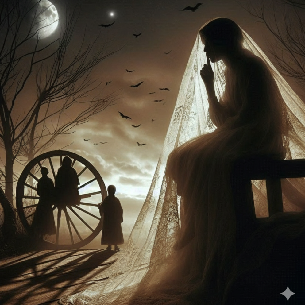 Haunting instrumental with faint echoing laughs in the background