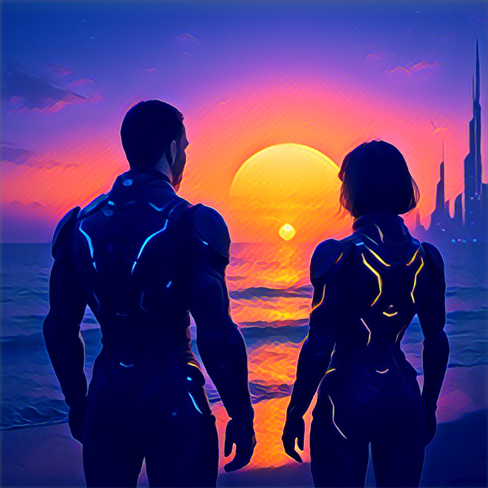 A dynamic stadium live show opens with lo-fi acoustic guitar and folk textures, then surges into cinematic cyberpunk pop and trance layers, Female and male vocals interplay above glitchy, lo-fi beats, The chaos crescendos through halftime drops, explosive double tempo EDM/techno, euphoric crowd chants, and a soaring, effects-drenched guitar solo, The finale fuses folk strumming with energy surges and chill synth atmospheres, balancing crowd euphoria with cinematic tension, pop, upbeat, distorted, trap, EDM, happy, rock, aggressive