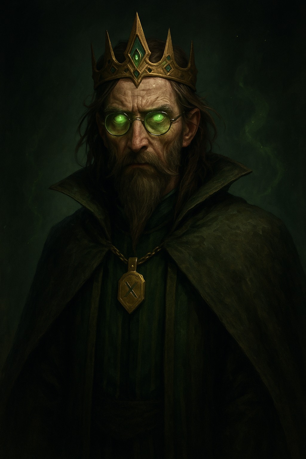 Epic dark orchestral instrumental evoking tragic divinity, Deep choirs, organ, accordion and powerful strings lead the melody, Heavy drums echo like ritual heartbeats, The atmosphere feels sacred yet doomed—music of a fallen king once worshiped and now cursed, Blend sorrow, grandeur, and lingering holiness, as if his legacy haunts the ruins that still bear his crown, atmospheric, cinematic, male vocals, dark choir chorus