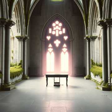 18th century gothic prayer, piano, minimalistic, echoing like in an enormous empty church, the sound of wind is softly heard in the background, the piano plays in triplets during moments of tension, lonesome in absolution, stripped back