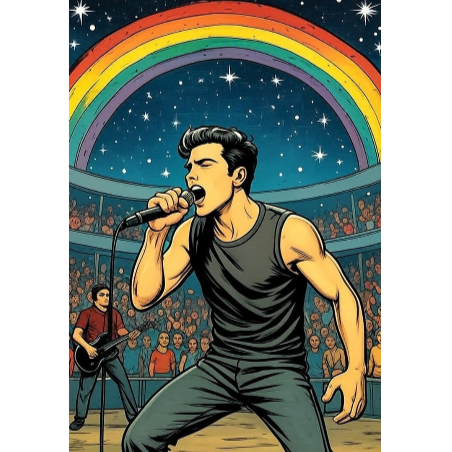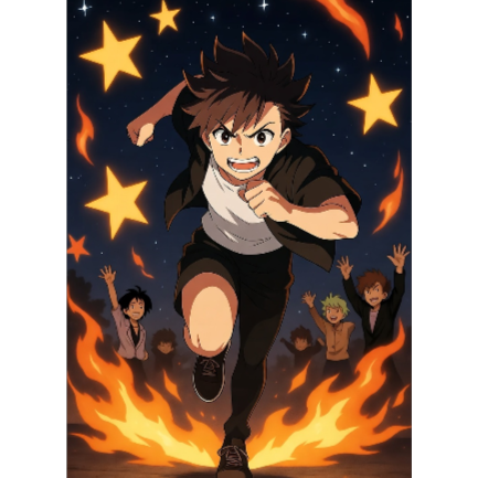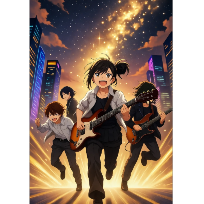 J-Rock, Anison, 80s pop rock anime opener, upbeat male vocals, 154 BPM, A major, techno, electric guitar riffs, swinging bass, powerful drums, high-energy chorus, adventurous, humorous, club groove