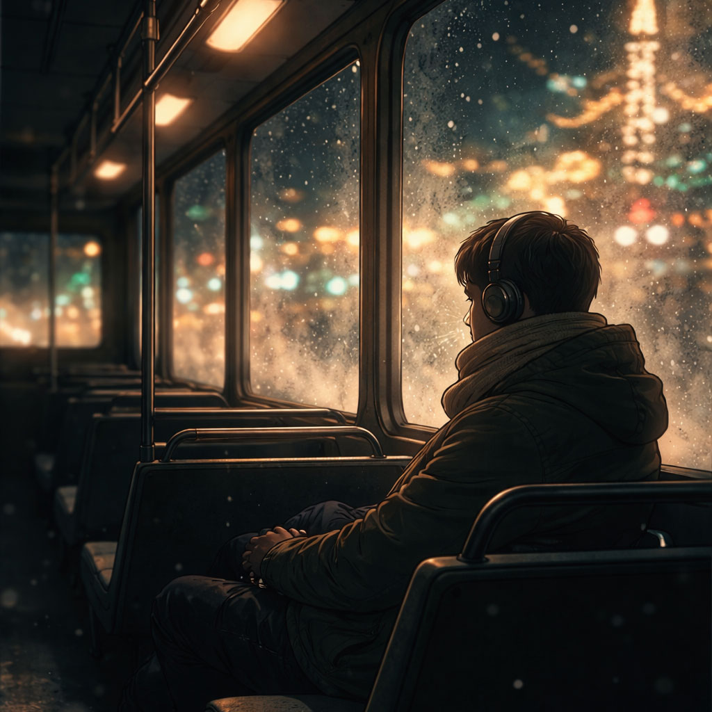lofi, holiday, winter night, urban commute mood, distant filtered bell tones blended with street noise ambience, bus interior hum, passing traffic hiss, introspective, minimal felt piano, muted electric guitar swells, slow tempo, sparse brushed drums, vinyl crackle, melancholic calm, solitary movement through the city, instrumental