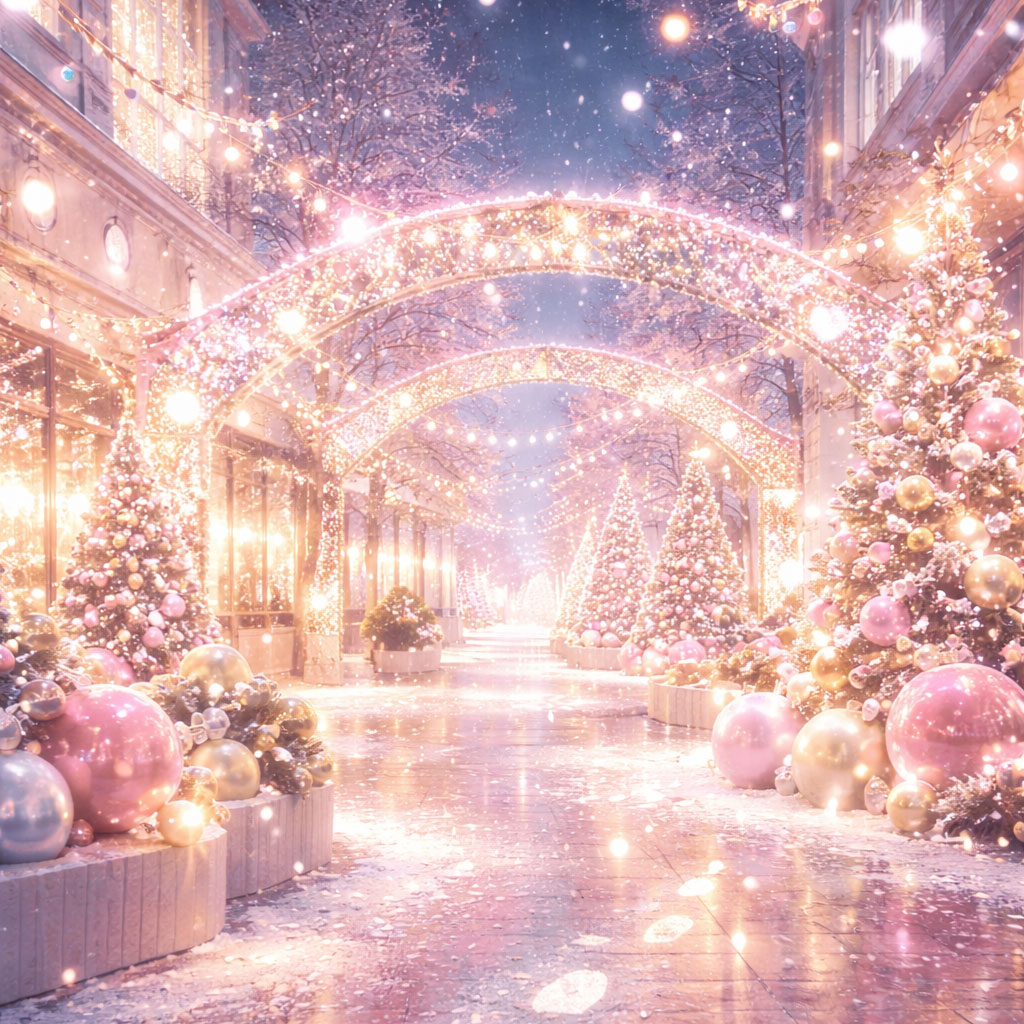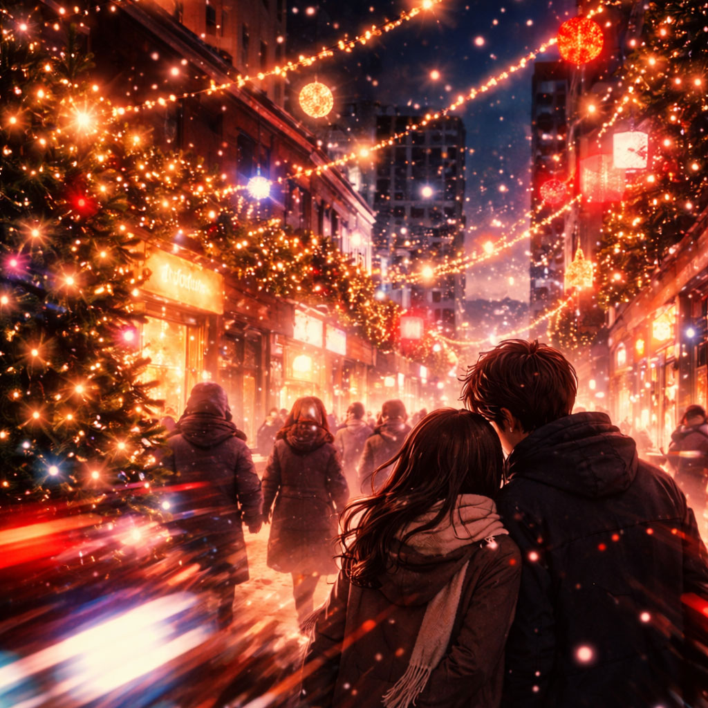 lofi, holiday, winter sparkle atmosphere, celesta and glockenspiel accents, warm pastel synths, gentle melodic hooks, soft rounded bass, relaxed upbeat groove, light rhythmic bounce, cozy joy, nostalgic anime winter mood, glowing city lights, smooth textures, instrumental