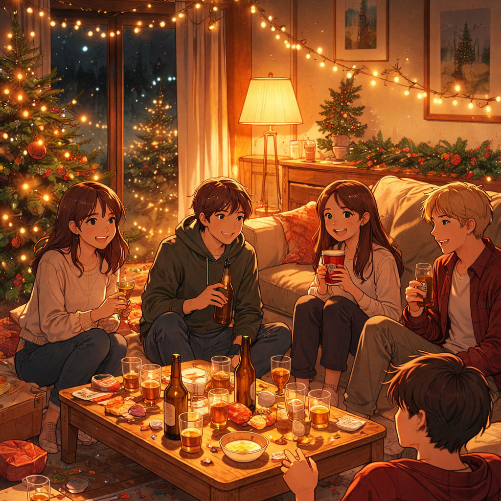 lofi, holiday, christmas night party atmosphere, warm indoor room tone, distant muffled laughter ambience, clinking glasses texture, noisemaker echoes softened in reverb, upbeat mellow chord progressions, warm bass groove, light swing drum pattern, nostalgic cheer with slight chaos, imperfect timing, slightly messy textures, tape saturation, vinyl noise, communal warmth after midnight, instrumental