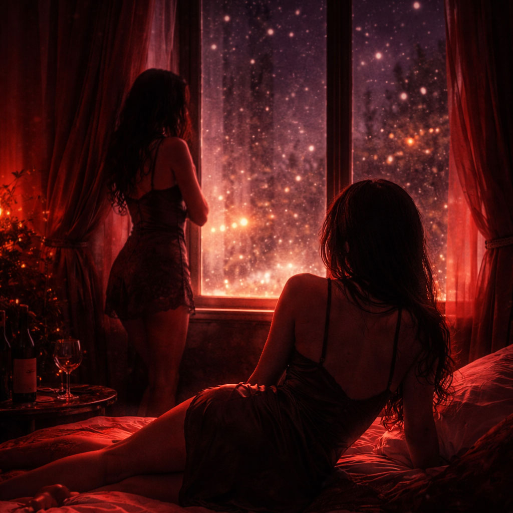 lofi erotic trapwave, dark j-rap fusion, female duet energy implied, lofi texture layer, holiday, after-hours christmas night atmosphere, red-lit interior glow, snowfall outside windows, deep sub-bass pulses, slow sensual trap rhythm, muted synth stabs, breathy pad textures, luxurious darkness, seductive restraint, forbidden warmth, intimacy chosen not given, nocturnal indulgence, instrumental